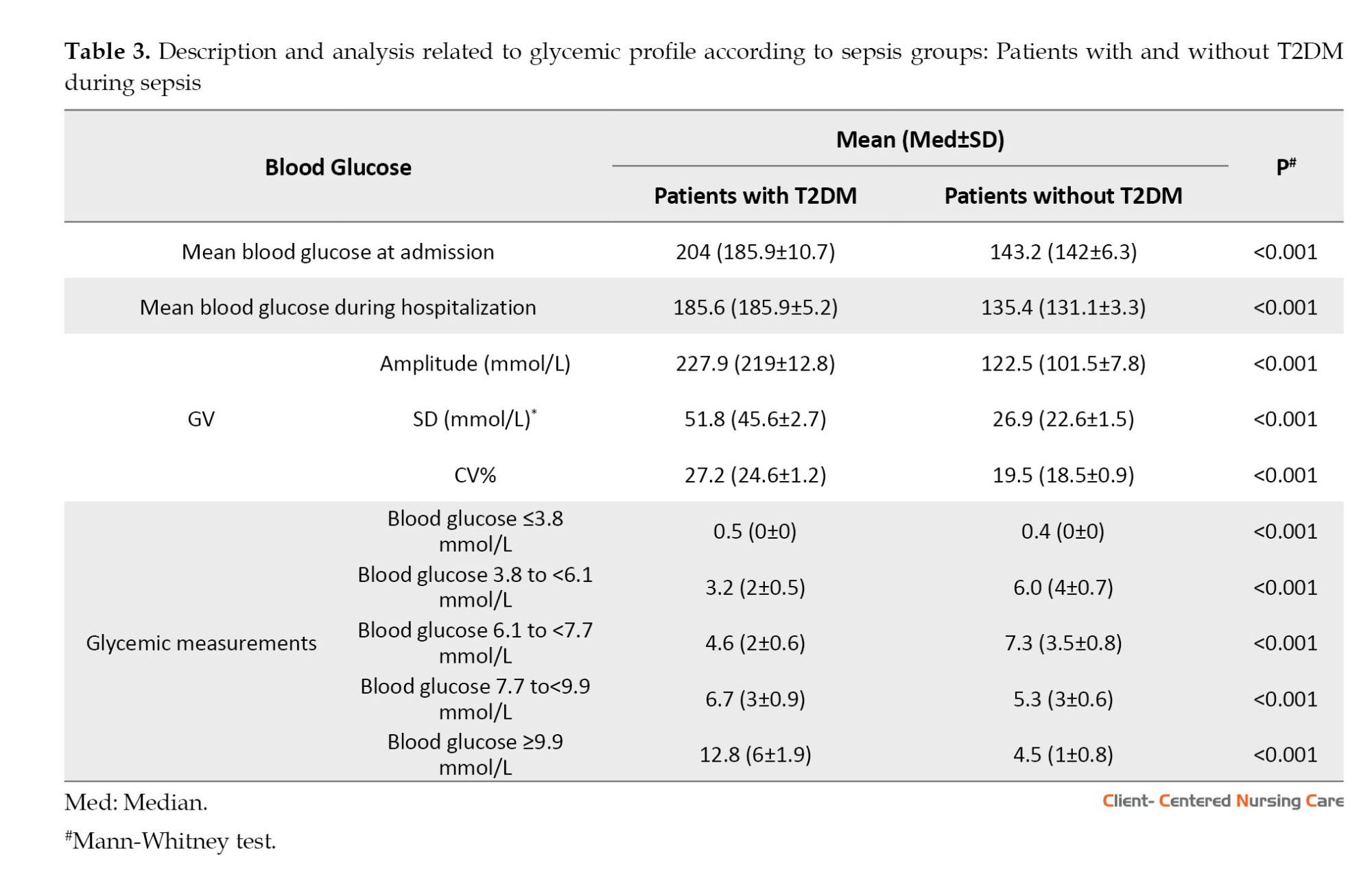 A previous study reports that a higher GV and percentage of deaths are observed among patients with DM and sepsis or septic shock than among patients without DM. In this study, patients with DM had a greater need for blood glucose testing and interventions to regulate glucose levels, suggesting an increased demand for care from nursing staff (Silveira et al., 2017).